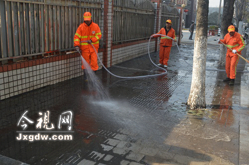 洁亚公司环卫工人在阳明东路上清洗人行道
