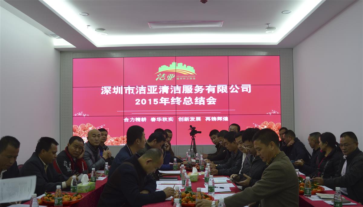 合力精耕,春华秋实,创新发展,再铸辉煌!2016年1月16日,深圳市洁亚清洁服务有限公司2015年终总结会议在深圳公司总部会议室胜利召开。与会人员有总部各部门负责人、深圳各项目第一负责人、车队长。公司总经理朱晓芬女士、集团总裁朱小萍女士、集团总裁助理兼地产公司总经理徐洁女士出席会议。