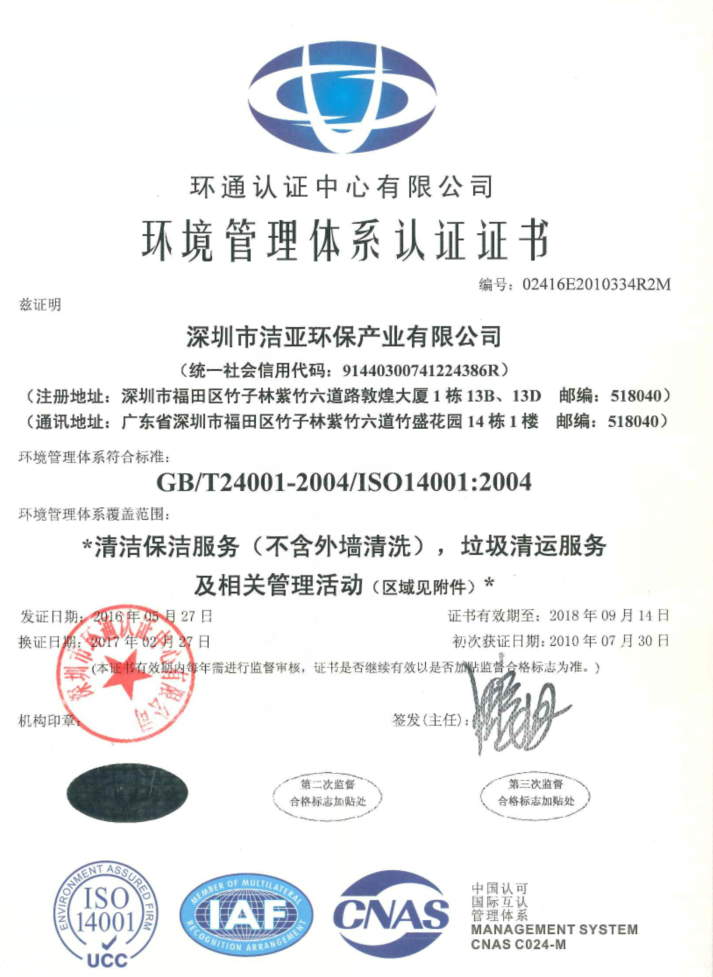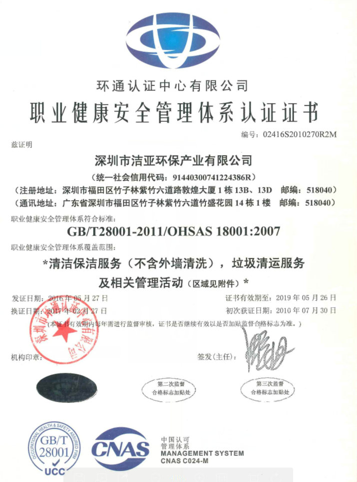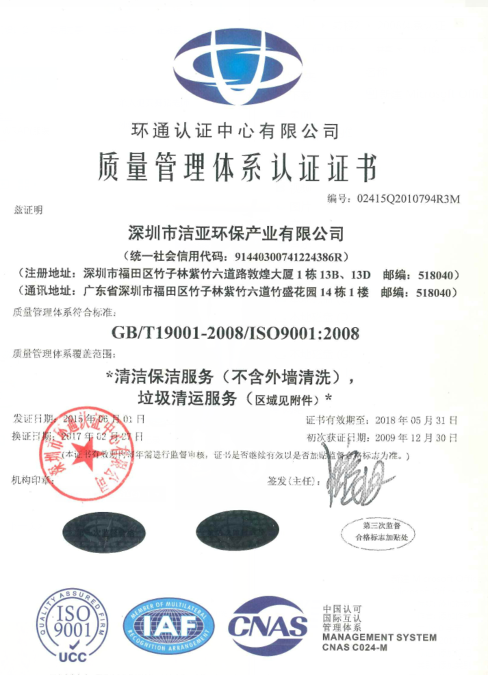 自成立以来,洁亚清洁积极学习国际先进管理经验,并结合自身行业特点努力加以消化吸收,在行业内率先构建、实施了一套较为完整的管理体系,先后顺利通过ISO9001质量管理体系、ISO14001环境管理体系、OHSAS18001职业健康安全管理体系等一系列质量规范体系的认证审核。
