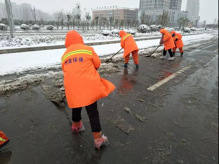 1月3日至4日,接连的雨雪天气造成路面积雪已深达30cm左右。洁亚56人小分队不畏寒冷,顶风冒雪天还未亮就开始作业。
