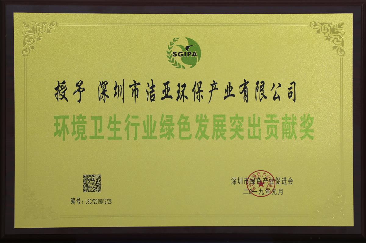 2019年1月27日,深圳市绿色产业促进会第四届绿色创建表彰大会在深圳启腾奥林宾馆隆重举行,深圳环保行业领军企业及媒体精英齐聚一堂,共同见证此次行业盛会,会议对2018年度深圳市环卫行业优秀集体和个人进行了表彰,洁亚环保凭借良好诚信的行业口碑与服务品牌、踊跃参与行业活动、积极支持行业与协会建设,洁亚环保荣获“绿色产业发展突出贡献企业”和“优秀会员企业”光荣称号,洁亚环保朱晓芬总经理光荣当选为深圳市绿色产业促进会理事。