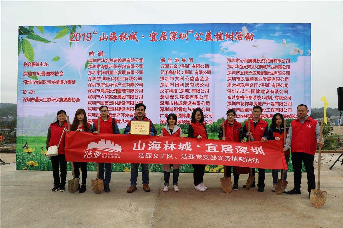 3月24日,2019“山海林城,宜居深圳”公益植树活动在深圳市龙岗区宝龙同德公园隆重举行,洁亚环保义工队义工、党支部党员参加了此次公益植树活动。在植树活动仪式上,龙岗区城管局、龙岗区市政服务中心等主管单位为洁亚环保颁发了“追梦深圳,绿色家园”荣誉牌匾和证书。