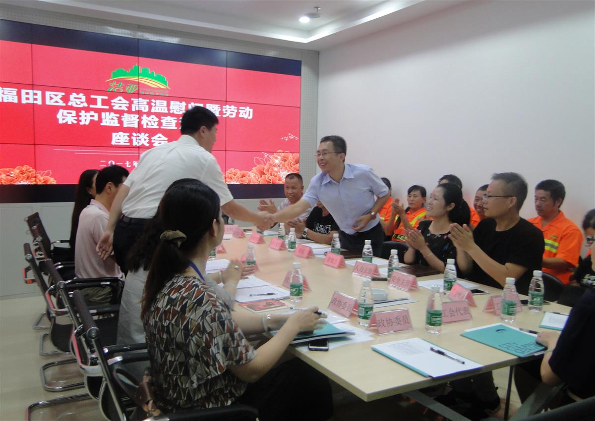 慰问检查组由福田区政协副主席、党组副书记杨金山,福田区总工会副主席张继生带队,包括多名人大代表、政协委员和工会代表。在洁亚一楼会议室,洁亚副总经理陈实详细介绍了公司各项劳动保护措施落实情况,行政部经理、安全主管郭小明对高温作业安全措施实施情况进行了补充说明。