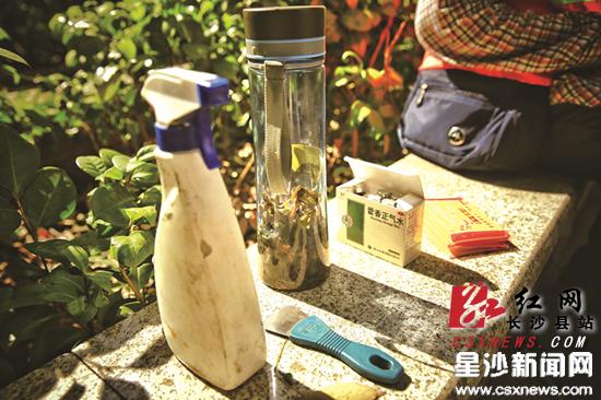 由于七八月份天气太过炎热,柳学武每天都用鱼腥草泡水,这种300毫升的大杯,他一天能喝10杯,这也是他日常养生的一个小方法。除了每天喝鱼腥草水外,柳学武随身携带的包里还备有藿香正气水、纸巾等,有时候他还会将毛巾弄湿盖在头上,用来降温。